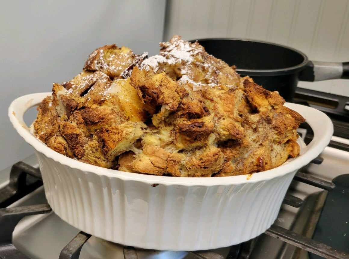 Whip eggs and add sugar, vanilla, cinnamon, milk/ice cream together. Fold the bread cubes into the liquid ingredients, adding extra milk as needed to ensure everything is evenly moistened. For optimal texture and flavor, let the mixture rest overnight so the bread can fully absorb the custard.
